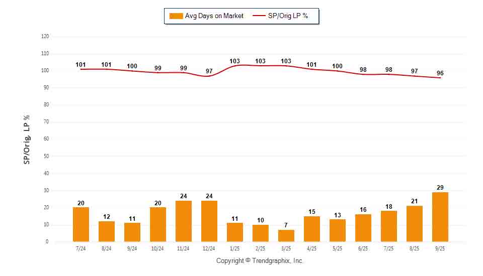 The average Days on Market (DOM) shows how many days the average property is on the market before it sells. An upward trend in DOM trends to indicate a move towards more of a Buyer’s market, a downward trend indicates a move towards more of a Seller’s market. The DOM for September 2025 was 29, up 38.1% from 21 days last month and up 163.6% from 11 days in September of last year.
