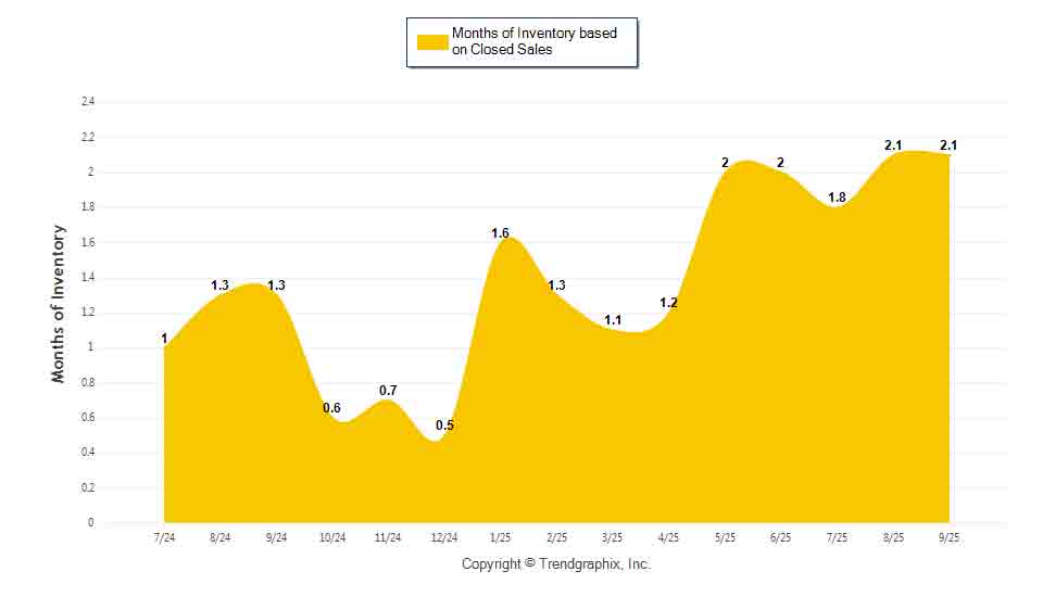 The September 2025 Months of Inventory based on Closed Sales of 2.1 was increased by 61.2% compared to last year and the same compared to last month. September 2025 was Seller's market.