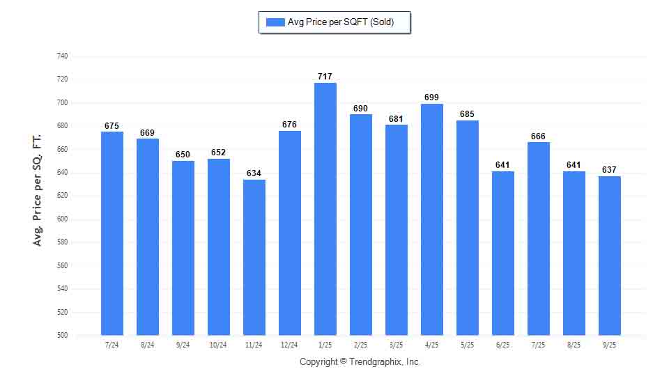 The Average Sold Price per Square Footage is a great indicator for the direction of property values. Since Median Sold Price and Average Sold Price can be impacted by the 'mix' of high or low end properties in the market, the Average Sold Price per Square Footage is a more normalized indicator on the direction of property values. The September 2025 Average Sold Price per Square Footage of $637 was down 0.6% from $641 last month and down 2% from $650 in September of last year.