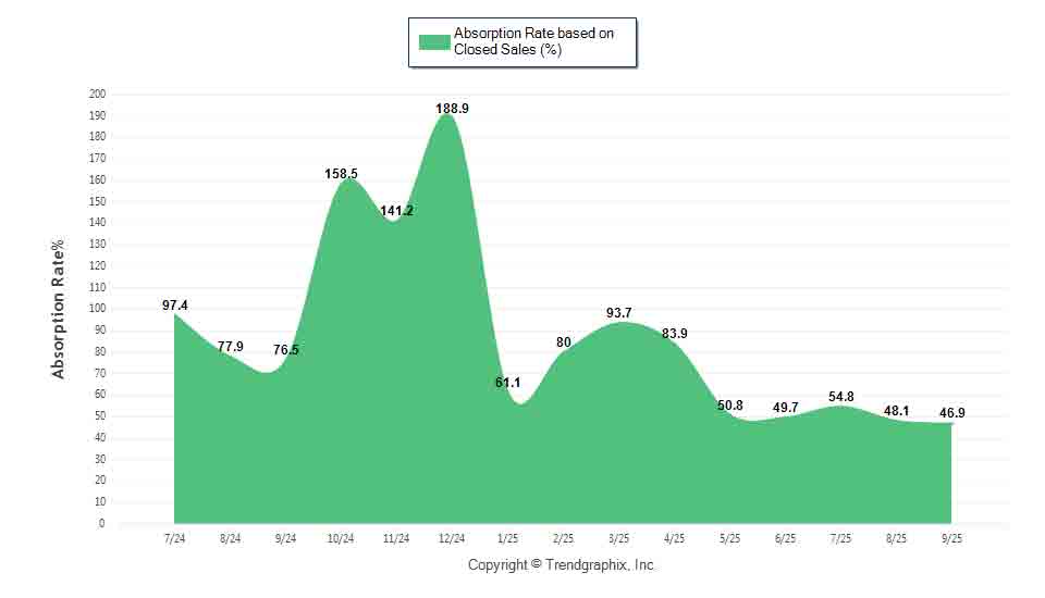 The September 2025 Absorption Rate based on Closed Sales of 46.9 was decreased by 38.7% compared to last year and down 2.5% compared to last month.