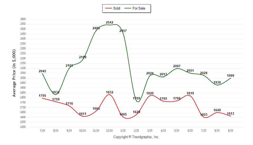 The Average Sold Price in September was $1,613,000, down 6% from $1,716,000 in September of 2024 and down 2.2% from $1,649,000 last month.